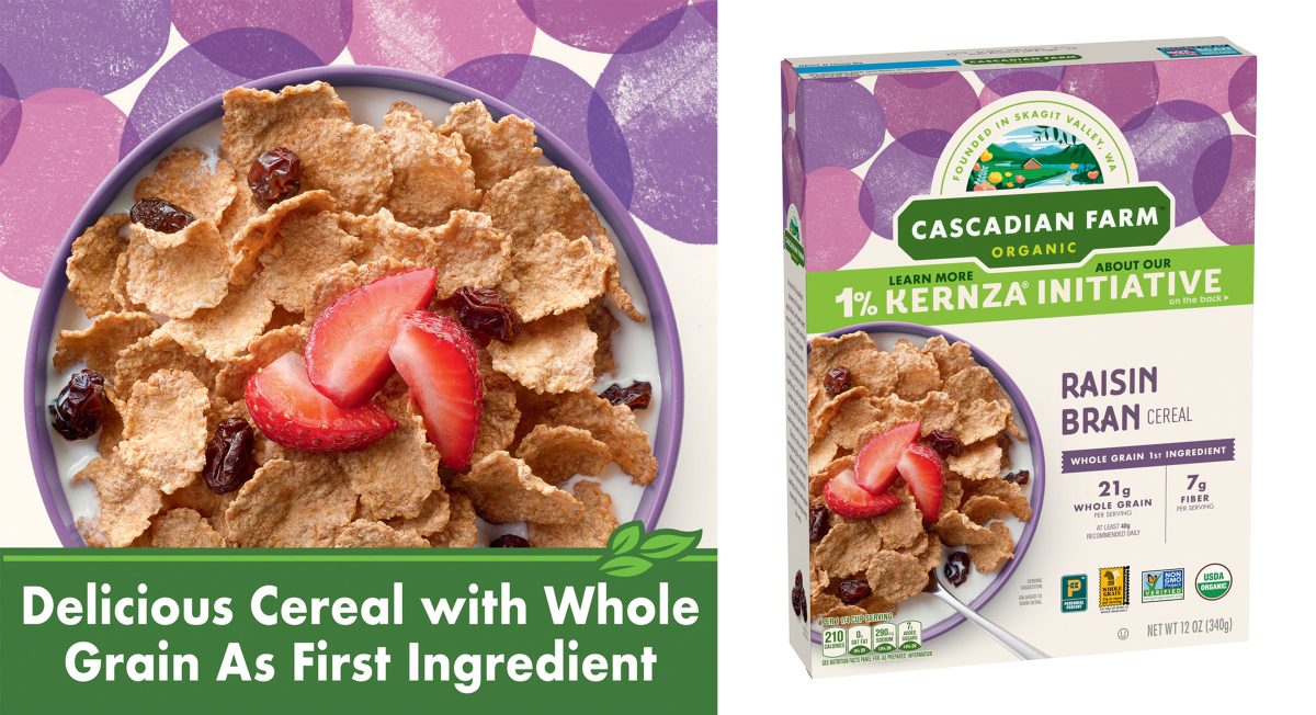 “Kernza’s slightly sweet, nutty flavor is a perfect complement to Cascadian Farm Honey Oat Crunch, Honey Oat Crunch with Almonds, Raisin Bran and Hearty Morning Fiber cereals.